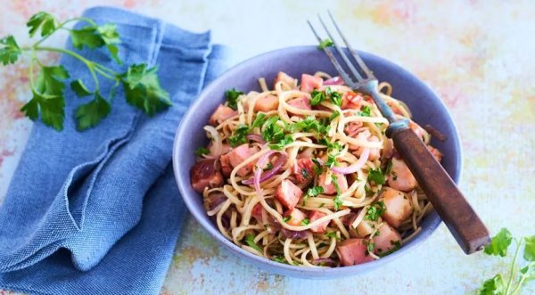 Название: Яичная лапша с салями, копченым беконом и красным луком