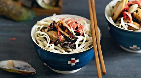Описание: 30 минутДополнительное время: 1 часДля приготовления 4 порций нужно:лапша удон — 400 гмидии без створок — 300–350 гмаринованный имбирь — 100 гсушеные водоросли вакаме — 50 гчеснок — 4 зубчикарисовый уксус – 1,5 ст. л.растительное масло (лучше арахисовое нерафинированное)сольПереложите мидии в миску. Добавьте рисовый уксус, перемешайте, поставьте в холодильник на 1 час.Замочите водоросли в холодной воде, 5 минут. Слейте воду, добавьте свежую, оставьте еще на 10 минут.В большой кастрюле доведите до кипения 4 л воды. Положите водоросли, через 1 минуту выключите огонь, дайте настояться под крышкой в течение 10 минут. С помощью шумовки переложите водоросли на доску и нарежьте тонкой соломкой. Воду в кастрюле сохраните.Нарежьте очищенный чеснок тонкими кружками. Положите в сковороду, полейте растительным маслом, прогрейте на среднем огне, пока чеснок не станет золотистым.Добавьте вакаме и мидии, увеличьте нагрев до максимального, готовьте 1–2 минуты.В бульоне из-под водорослей, вскипятив его и посолив, сварите лапшу согласно инструкции на упаковке. Откиньте на дуршлаг и сразу же разложите по тарелкам. Сверху положите мидии с вакаме и чесноком. Посыпьте мелко рубленным маринованным имбирем, подавайте.