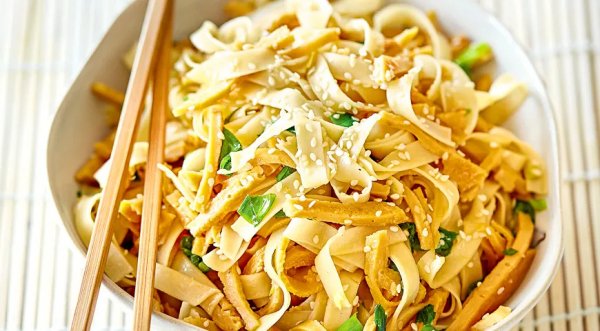 Описание: 20 минутДля приготовления 2 порций нужно:яичная лапша — 300 гяйца — 3 шт.зеленый или шнитт-лук — 1 средний пучоксемена кунжута (сырые) — 2 ст. л.соевый соус — 2 ст. л.рисовый или белый винный уксус — 1 ч. л.растительное маслотемное кунжутное маслосвежемолотый черный перецсольСварите лапшу в большом количестве кипящей подсоленной воды согласно инструкции на упаковке. Откиньте на дуршлаг, промойте холодной водой, дайте лапше обсохнуть. Взбейте яйца с 2 ст. л. воды комнатной температуры, соевым соусом и рисовым уксусом.В воке или в большой сковороде с антипригарным покрытием нагрейте немного растительного масла. Влейте яичную массу. Приготовьте тонкий омлет — яйца должны полностью схватиться.Переложите омлет на смазанную маслом доску и дайте слегка остыть. Разрежьте омлет на 3 части, затем нарежьте тонкой соломкой.Нарежьте белую часть зеленого лука как можно тоньше. Зеленую часть нарежьте чуть наискосок кусочками длиной примерно 2 см.Разогрейте в воке (или в той же сковороде, где жарился омлет) 1 ст. л. растительного масла. Положите весь зеленый лук и 1 ст. л. кунжута, чуть посолите, обжарьте в течение 1 минуты.Добавьте лапшу и омлет, поперчите, сбрызните кунжутным маслом, прогрейте 1–2 минуты, посыпьте оставшимся кунжутом и сразу же подавайте на стол.