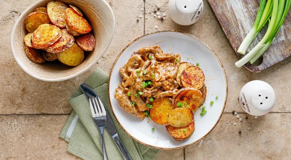 Описание: Говяжья вырезка – 1 кгрепчатая луковица средняя – 1 шт.сметана жирностью 20 % – 200 гтоматная паста – 1 ст. л.оливковое масло – 4 ст. л.мука – 10 гвода – 250 млсоль, свежемолотый черный перец – по ¼ ч. л.Обсушите вырезку бумажными полотенцами, положите на доску и аккуратно срежьте пленочки острым ножом. Разрежьте мясо поперек волокон ломтиками толщиной 1,5 см.Нарежьте ломтики полосками шириной 1–1,5 см. Старайтесь, чтобы кусочки были одинаковые, так мясо прожарится равномерно.Соедините и перемешайте муку, соль и перец. Сложите мясо в большую миску и посыпьте мучной смесью. Аккуратно перемешайте. Очищенную луковицу нарежьте четвертинками колец.В глубокой сковородке на сильном огне разогрейте оливковое масло. Небольшими порциями очень быстро обжаривайте мясо, выкладывая на сковородку в один слой. Мясо должно только покрыться золотистой корочкой. Обжаренное мясо перекладывайте на тарелку. Продолжайте, пока не обжарите всю вырезку.Добавьте в сковородку немного масла и выложите лук. Готовьте на среднем огне, часто перемешивая лопаткой, до легкого золотистого цвета, 4-5 мин. Добавьте томатную пасту и прогрейте, 1 мин. Влейте в сковородку горячую воду, перемешайте и доведите до кипения. Уменьшите нагрев до слабого и готовьте соус 10 мин. Затем добавьте обжаренное мясо и прогрейте, 1 мин. Добавьте в сковородку сметану, перемешайте и прогревайте 1 мин. Попробуйте бефстроганов, при необходимости добавьте соль и перец. Снимите с огня и подавайте с гарниром из картофеля.ПОЛЕЗНЫЙ СОВЕТЕсли вы готовы немного отойти от классики, добавьте к вырезке несколько шампиньонов или белых грибов, нашинкованных ломтиками, и соленый огурец, нарезанный тонкой соломкой — блюдо приобретет еще более русский колорит.КСТАТИГотовить бефстроганов можно не только из вырезки. Отлично подойдут такие отрубы, как толстый край или оковалок. При использовании других частей туши время приготовления несколько увеличится, ведь вырезка — наиболее нежное мясо.