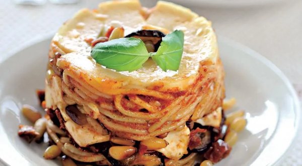 Описание: 1 часДля приготовления 6 порций нужно:спагетти — 300 гкрупный баклажан — 1 шт.консервированные помидоры в собственном соку — 1 банка (400 г)адыгейский сыр — 200 гтертый твердый сыр — 30 глуковица шалота — 1 шт.очищенные кедровые орехи — 30 гвяленые помидоры — 4 шт.базилик — 2 веточкисахар — 1 ч. л.оливковое масло — 5 ст. л.сольНарежьте баклажан тонкими ломтиками и посыпьте солью. Оставьте на 15 минут, затем промойте, отожмите и обжарьте на 2 ст. л. масла с обеих сторон. Обсушите на бумажных полотенцах.Листочки базилика нарежьте полосками. Лук-шалот измельчите, жарьте на 2 ст. л. масла 3 минуты. Добавьте помидоры, базилик, сахар и щепотку соли. Закройте крышкой и готовьте на слабом огне 20 минут. Измельчите в блендере и дайте соусу остыть.Кедровые орехи поджарьте на сухой сковороде до появления аромата. Отварите спагетти согласно инструкции на упаковке, до состояния аль денте. Откиньте на дуршлаг, промойте проточной водой, затем перемешайте с соусом и тертым сыром.Адыгейский сыр нарежьте тонкими ломтиками. Вяленые помидоры нарежьте мелкими кубиками. Смажьте оставшимся маслом формочки диаметром 7–8 см.Аккуратно выложите на дно каждой из них немного адыгейского сыра и треть спагетти, завернув их, как «гнездышки». Посыпьте кедровыми орешками, выложите слой сыра и немного вяленых помидоров. Сверху распределите несколько ломтиков жареных баклажанов.Уложите треть спагетти. Добавьте орешки, сыр, помидоры и баклажаны. Уложите оставшиеся спагетти так, чтобы полностью прикрыть остальные ингредиенты. Запекайте в предварительно разогретой до 180 °С духовке 20 минут.Полезный советПеред подачей дайте запеканкам немного остыть, после чего переверните формочки на тарелки. Можно украсить листочками базилика.