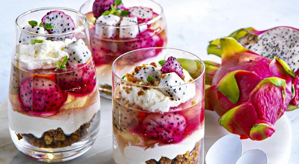 Описание: 1 час 30 минутДополнительное время: 4 часаДля приготовления 6 порций нужно:питахайя — 2 шт.смородина красная замороженная — 100 гбазилик для подачиДля желе из шампанского:шампанское полусладкое — 500 млжелатин листовой — 20 гДля крема:сливочный сыр — 400 гсливки жирностью 20% — 120 млсахарная пудра — 1–2 ст. л.Для крошки:пряники без глазури — 200 гсливочное масло — 50 гсахар — 1–2 ст. л.Пряники нарежьте на кусочки, сложите в чашу блендера, измельчите до состояния крошки. В сковороде на сильном огне распустите сливочное масло, всыпьте пряничную крошку и сахар. Уменьшите огонь до чуть выше среднего и готовьте, постоянно помешивая, 10 минут. Переложите крошку на большую плоскую тарелку, дайте полностью остыть и подсохнуть.Соедините все ингредиенты для крема в чаше миксера и тщательно взбейте до однородности. Переложите в кондитерский мешок с круглой насадкой.Положите желатин в сотейник, залейте прохладным шампанским, оставьте набухать на 10–15 минут. Затем поставьте на слабый огонь и прогрейте до полного растворения желатина. Снимите с плиты и полностью остудите.Плоды питахайи разрежьте пополам. С помощью специального ножа-нуазетки вырежьте шарики, остатки мякоти нарежьте кубиками.Смородину разморозьте, переложите в чашу блендера вместе с соком, добавьте 50 мл питьевой воды, измельчите до однородности. Процедите массу через сито и залейте часть шариков питахайи. Оставьте на 30 минут, чтобы они успели окраситься и подмариноваться.На дно бокалов насыпьте по 2 ст. л. пряничной крошки, затем слой сливочного крема (немного оставьте для подачи). Сверху разложите шарики питахайи и залейте шампанским с желатином. Поставьте в холодильник до полного застывания.Перед подачей положите в бокалы остатки крема и кубики питахайи. Украсьте пряничной крошкой и листочками зеленого базилика.