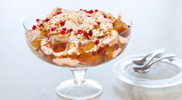 Описание: 1 час 30 минутДополнительное время: 1 часДля приготовления 6 порций нужно:ананас (свежий или консервированный) — 300 гбисквит — 200 гсахар — 200 гзерна граната — 125 гананасовый сок — 100 мллайм (сок и цедра) — 1 шт.ром — 50 млДля взбитых сливок:сливки жирностью 33–35% — 200 млсахарная пудра — 30 гДля кокосового крема:кокосовое молоко — 400 млжелтки — 4 шт.сахар — 50 гром — 4 ст. л.кукурузный крахмал — 35 гжелатин — 2 листаДля пралине:фисташки — 50 гсахарная пудра — 40 гРазогрейте духовку до 200 °С. Положите фисташки для пралине на противень, застеленный силиконовым ковриком, посыпьте сахарной пудрой и сбрызните водой (3 ст. л.). Поставьте в духовку до карамелизации, 8–10 минут. Остудите, затем крупно порубите или измельчите в блендере.Нарежьте бисквит кубиками и разложите на дно бокалов или толстостенных стаканов.Нарежьте ананас небольшими кусочками. Насыпьте сахар в большую глубокую сковороду, осторожно прогрейте, пока он не растворится и не начнет превращаться в карамель.Как только карамель приобретет темно-золотистый цвет, добавьте в сковороду ананас и ананасовый сок. Будьте осторожны — карамель может пузыриться и брызгаться. Перемешайте деревянной ложкой, доведите до кипения и добавьте 1/2 зерен граната, сок, ром и цедру лайма.Аккуратно встряхните сковороду, затем снимите с огня и дайте карамели остыть, 5 минут. Переложите ананасы с гранатом на бисквит, залейте карамелью. Оставьте до полного остывания.Для крема замочите желатин в холодной воде. Доведите кокосовое молоко до кипения. Разотрите желтки с сахаром и смешайте с кукурузным крахмалом. Тонкой струйкой влейте кокосовое молоко, постоянно размешивая венчиком. Затем перелейте обратно в сотейник, добавьте ром и варите до загустения, постоянно помешивая, 10 минут.Снимите сотейник с огня, добавьте отжатый желатин и перемешайте до полного растворения. Накройте крем пленкой, прижимая ее к поверхности, остудите.Разложите на остывший трайфл кокосовый крем. Уберите в холодильник минимум на 1 час.Взбейте сливки с сахарной пудрой до мягких пиков. Украсьте трайфл взбитыми сливками, оставшимися зернами граната и фисташковым пралине. Подавайте на стол.