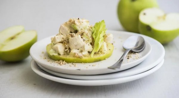 Описание: Филе куриной грудки (вареное) — 2 шт.яблоки (средние) — 2–3 шт.грецкие орехи — 1/3 стаканалимонный сок — 1 ст. л.сельдерей — 1 стебельизюм — 1/2 стаканасметана — 2 ст. л.майонез — 2 ст. л.порошок карри — 1/2 ч. л.свежемолотый черный перецсольНарежьте куриное филе маленькими кубиками. Стебель сельдерея очистите от толстых прожилок, а затем мелко нарежьте.В маленькой миске смешайте майонез, сметану, лимонный сок и порошок карри, посолите и поперчите. Смешайте в салатнице куриное филе, изюм и сельдерей, заправьте салат и оставьте на 10 минут.Аккуратно вырежьте сердцевину из яблок, нарежьте их кружками толщиной 4–5 мм и положите на блюдо. На каждый кружок яблока выложите горкой салат. Измельчите грецкие орехи в блендере и посыпьте салат.