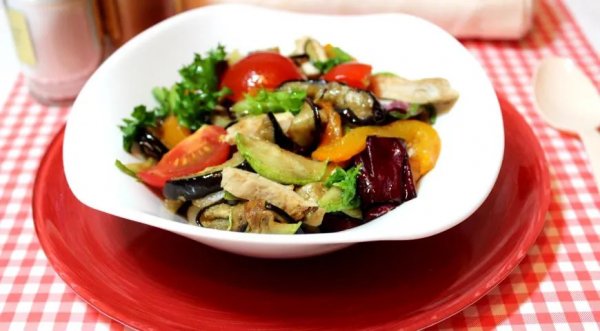 Описание: Куриное филе — 650 гбаклажан — 1 шт.цукини — 1 шт.салатные листья (ассорти) — 100 гболгарский перец — 1 шт.помидоры черри — 250 голивковое масло — 4 ст. л.бальзамический уксус — 1 ч. л.соль по вкусуБолгарский перец положите на противень и поместите в разогретую до 220 °С духовку, запекайте в течение 10–15 минут. Затем перец остудите, очистите от семян и кожуры и нарежьте небольшими полосками.Баклажан и кабачок вымойте, обсушите и нарежьте тонкими ломтиками. Обжарьте с обеих сторон на сковороде-гриль, смазанной оливковым маслом. Дайте овощам немного остыть и нарежьте их небольшими полосками.Куриное филе вымойте, обсушите, разрежьте на несколько частей. С помощью кулинарного топорика отбейте и обжарьте с обеих сторон на сковороде-гриль. Мясо немного остудите и нарежьте небольшими полосками.Листья салата помойте, обсушите, порвите на небольшие куски и положите в миску. Добавьте нарезанный перец, баклажан, кабачок и куриное филе.Помидоры помойте, разрежьте на 2 части (крупные на 4) и добавьте в миску с салатом. Посолите, сбрызните бальзамическим уксусом и оливковым маслом, перемешайте и подавайте на стол.