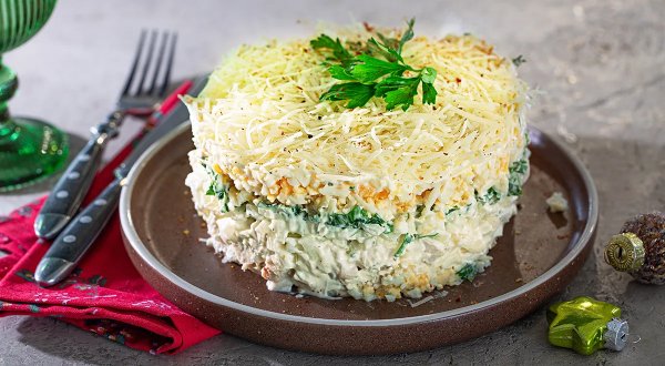 Описание: Куриное филе — 300 гяйца — 4 шт.лук репчатый — 100 гсыр твердый — 70 гмайонез провансаль — 70 гсметана 30% — 50 гуксус яблочный 6% — 2 ст. л.петрушка — 1 веточкасахар-песок — 1 ч. л.перец черный свежемолотыйсольСварите курицу. Положите филе в кастрюлю и залейте водой. Поставьте на средний огонь и доведите до кипения.Снимайте шумовкой пену, которая будет образовываться во время варки. Немного посолите воду и варите филе 15 минут. Уберите с огня, закройте кастрюлю и дайте куриному мясу остыть: оно дойдет до полной готовности и при этом останется сочным.Яйца сварите вкрутую — не более 10 минут после закипания, иначе желток покроется неаппетитным серым налетом. Затем воду слейте, а яйца охладите проточной водой.Репчатый лук нарежьте маленькими кубиками. Переложите в мисочку, добавьте сахар. Залейте яблочным уксусом и перемешайте. Оставьте на 10 минут. За это время лук утратит горечь и приобретет пикантный вкус.Сыр натрите в мелкую стружку. С веточки петрушки оборвите листья и оставьте до использования. Яйца очистите и мелко нарежьте. Остывшее куриное филе нарежьте сначала пластинами, затем кубиками.Для соуса соедините майонез со сметаной. Посолите, поперчите и перемешайте. На плоскую тарелку установите большое кулинарное кольцо. Распределите в нем слой куриного филе и немного соуса. Разровняйте.Сверху пересыпьте луком, предварительно отжав его от маринада. Смажьте соусом. Положите яйца и разровняйте. Покройте соусом. Насыпьте тертый сыр, распределяя его равномерно. Уберите салат в холодильник на 1 час. Снимите кольцо и украсьте листочками петрушки.