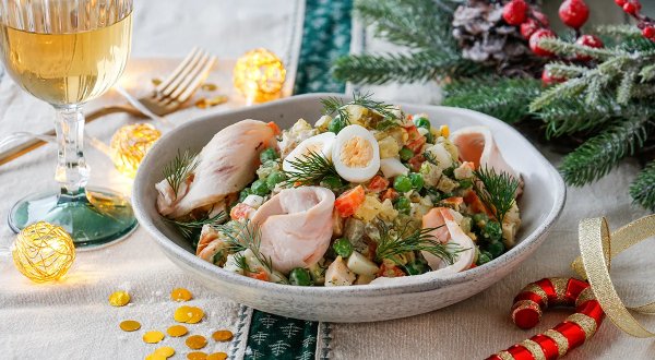 Описание: Клубни картофеля среднего размера — 3 шт.морковь среднего размера — 3 шт.яйца — 4 шт.копченое куриное филе — 750 гмаринованные огурцы — 5–6 шт.замороженный зеленый горошек — 450 гзеленый лук — 30 гукроп — 15 гмайонез — 250 гсоль, свежемолотый черный перец — по вкусуПодготовьте все ингредиенты для оливье. Картофель и морковь тщательно вымойте щеткой, поместите в кастрюлю и варите 20–30 минут. Периодически проверяйте готовность. Дайте остыть.Яйца поместите в кастрюлю и залейте водой. Доведите до кипения на среднем огне. Варите 10 минут (не дольше, иначе желток приобретет серую оболочку). Охладите под проточной водой и очистите. Мелко нарежьте.Картофель и морковь очистите, нарежьте кубиками со стороной 5 мм. Так же нарежьте половину курицы и маринованные огурцы. Вторую часть копченого филе нарежьте тонкими ломтиками.В кастрюле доведите до кипения воду и немного посолите ее. Положите зеленый горошек. Снова доведите до кипения и варите 5 минут. Откиньте на дуршлаг и обдайте несколько раз ледяной водой, чтобы горошек сохранил цвет.Зеленый лук и укроп вымойте, обсушите и очень мелко нарежьте. Перемешайте все подготовленные ингредиенты оливье (картофель, морковь, горошек, яйца, огурцы, лук и укроп) в большой миске.Приправьте солью и черным перцем, заправьте майонезом. Перемешайте и выложите оливье в салатник. Украсьте отложенными ломтиками копченой курицы и подайте на стол.