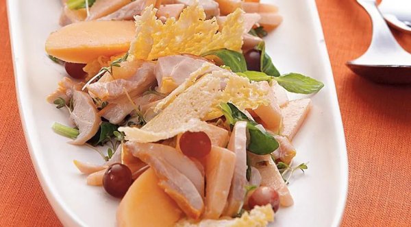 Название: Салат с курицей, дыней и чипсами из пармезана