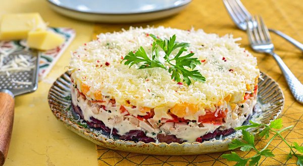 Описание: Курица копченая — 250 гфасоль красная консервированная — 240 гперец сладкий красный — 200 гяйца — 3 шт.сыр полутвердый — 100 гмайонез — 150 гпетрушка — 15 гчеснок — 2 зубчикаОтделите мясо копченой курицы от костей. Можно брать куриную грудку или бедро без кожи. В рецептуре уже указан чистый вес курицы без костей. Нарежьте филе небольшими кубиками.Сладкий перец освободите от плодоножки и семян, вырежьте перегородки. Нарежьте перец короткой соломкой. Длина кусочков должна быть не больше 2 см. Петрушку мелко нарубите.Фасоль переложите из баночки в дуршлаг, чтобы слить всю жидкость. Слегка помните фасоль толкушкой так, чтобы половина фасолин осталась целой. Чеснок очистите, пропустите через пресс и смешайте с фасолью.Начните собирать салат в салатнице слоями или на блюде при помощи кольца. Первым слоем выложите полураздавленную фасоль с чесноком. Теперь вам станет понятно, почему мы ее слегка раздавили — нижний слой должен держать всю конструкцию.Смажьте слой фасоли майонезом и присыпьте частью петрушки. Вторым слоем выложите кусочки копченой курицы, смажьте майонезом и посыпьте петрушкой.Третьим слоем выложите сладкий перец, затем майонез, петрушку и яйца. Покройте слой яиц майонезом. Натрите сыр на мелкой терке и посыпьте пушистой стружкой салат.Дайте салату пропитаться и настояться — для этого поставьте его в холодильник на пару часов. Перед подачей украсьте салат с копченой курицей и фасолью зеленью петрушки.