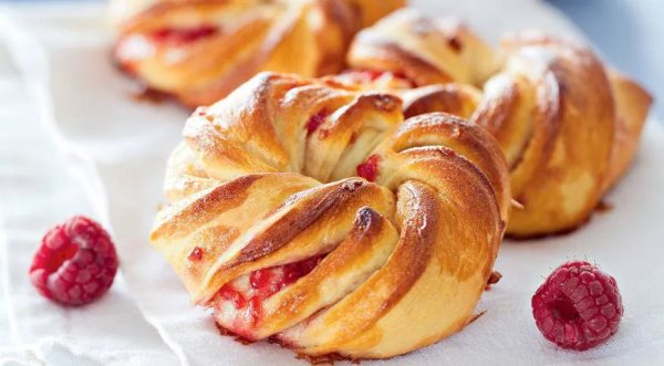 Описание: 500 г муки25 г свежих дрожжей или 7-8 г сухих3/4 стакана молока2 ст. л. сахара2 яйца60 г сливочного масла1/2 ч. л. соли1,5 стакана малинового джемаРазотрите дрожжи с 2–3 ст. л. теплого молока и оставьте на 15 мин., пока они не поднимутся шапочкой. Смешайте яйца с сахаром и солью. Растопите сливочное масло. Налейте в миску оставшееся теплое молоко, добавьте яйца и дрожжи, всыпьте половину муки и размешайте. Постепенно всыпьте в тесто всю муку, затем влейте растопленное масло и вымесите тесто, пока оно не станет гладким и не перестанет прилипать к рукам. Затяните миску пленкой и поставьте в теплое место для подъема на 1 ч.Обомните подошедшее тесто, немного промесите и снова поставьте в теплое место.Готовое тесто раскатайте в прямоугольник 60х30 см и смажьте малиновым джемом, отступая на 1,5 см от края.Мысленно разделите прямоугольник по длинной стороне на 3 части и сложите тесто втрое. У вас получится прямоугольник 30х20 см.Защипните края теста и слегка прокатайте скалкой по поверхности. Разрежьте поперек на 12 полосок шириной 2,5 см.Перекрутите каждую полоску 3–4 раза и сложите колечком, соедините концы. Разложите на противне, застеленном пергаментом, и выпекайте в разогретой до 190 °С духовке 15 мин. Остудите на решетке и посыпьте сахарной пудрой.