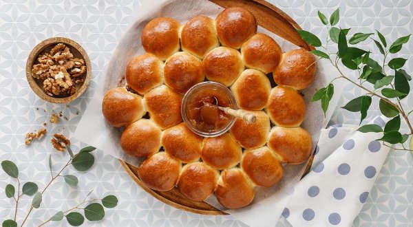 Описание: Для начинки:повидло или джем апельсиновый или абрикосовыйорехи грецкие очищенные – 100 гфундук очищенный и обжаренный – 50 гпорошок какао – 10 гДля теста:мука пшеничная высшего сорта, желательно с содержанием белка не менее 11% - 600 гсахар – 70 гмасло сливочное, размягченное – 70 гдрожжи прессованные – 6 г или 2 г сухие быстродействующиеяйцо категории С0 – 1 шт.молоко цельное комнатной температуры – 250 млсоль мелкая – 10 гмёд жидкий – 15 гцедра 1 лимонаДополнительно:1 яйцо категории С1молоко цельное –1 ст.л.растительное масло для обработки мискиСмешайте венчиком до однородности молоко с сахаром, медом, яйцом, мелко натертой лимонной цедры и дрожжами.Добавьте к смеси жидких составляющих муку и соль. Вымесите тесто до однородности. Добавьте масло и вымешивайте тесто еще 10 минут, до идеальной гладкости.Соберите тесто в шар, поместите его в миску, смазанную растительным маслом. Накройте и оставьте для брожения на 2 часа при температуре 24-26С. В середине этого времени сделайте одну обминку теста.Разделите тесто на порции примерно по 40 г. Придайте им форму шарика, накройте и оставьте отдохнуть на 12-15 минут.Противень застелите бумагой для выпечки. В середину поставьте жаропрочный рамекин или пустую консервную банку и смажьте внешнюю сторону растительным маслом.Орехи нарубите ножом или измельчите в чаше кухонного комбайна в импульсном режиме, не очень мелко. Смешайте все ингредиенты начинки.Раскатайте каждый шарик в круглую лепешку. Соберите края теста вокруг начинки, плотно соедините и сформуйте круглую булочку.Выкладывайте булочки вокруг размещена на расстоянии друг от друга, формируя 2-3 ряда.Прикройте булочки пленкой и оставьте на 60-75 мин. при комнатной температуре. К концу этого времени булочки соединятся между собой.Смешайте слегка взбитое яйцо с молоком и смажьте поверхность булочек. Выпекайте 25-30 минут при температуре 180°C.