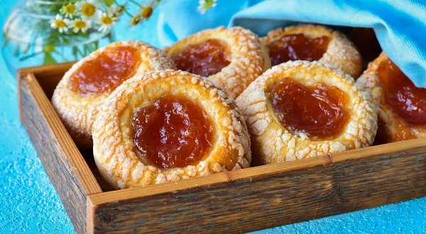 Описание: Для начинки:яблочное повидло – 60 гсливочное масло – 40-50 гДля опары:мука пшеничная высшего сорта –250 гвода комнатной температуры –150 гдрожжи прессованные –13 г или сухие быстродействующие 4 гДля отделки:мука пшеничная высшего сорта –10 гсахар –15 гДля отсдобки:мука пшеничная высшего сорта –15 гсахар – 85 гсливочное масло – 15 гванильный сахар – 5 гмасло растительное – 1 ч.л.яйцо – 5 г (1 ч.л.)Для теста:опара – все количествомука пшеничная высшего сорта –225 гвода комнатной температуры – 65 гсоль – 5 гЗамесите опару. Если вы пользуетесь прессованными дрожжами, растворите их в воде. Сухие дрожжи добавьте в муку. Смешайте все ингредиенты для опары до однородности, затяните миску пленкой или закройте крышкой и оставьте для брожения на 4 часа при температуре 30 С.Для теста смешайте всю опару с водой и мукой и вымешивайте, пока не образуется плотный комок. Добавьте соль и еще раз промесите тесто. Переложите тесто в чистую миску, затяните ее пленкой или накройте крышкой и оставьте для брожения на 1 час.Разбейте яйцо в мисочку и перемешайте вилкой до однородности. Подготовьте отделку: смешайте муку и сахар, масло растопите. Застелите бумагой для выпечки два противня.Добавьте в тесто сдабривающие ингредиенты (отсдобку), забрав 15 г взбитого яйца. Вымесите тесто еще раз. Переложите тесто в миску, закройте и оставьте для брожения еще на 1 час 30 минут. Через 50 минут от начала брожения сделайте одну обминку.Взвесьте выбродившее тесто и разделите на 12 частей весом примерно по 70 г. Придайте каждой части форму шарика.Поочередно окуните каждый шарик сначала в растопленное масло, затем в смесь муки и сахара. Выкладывайте в шахматном порядке, по 6 штук на противень. Прикройте пленкой.Через 1 час деревянной толкушкой или концом скалки сделайте в заготовке углубление и с помощью кондитерского мешка или двух чайных ложек заполните его повидлом. Снова закройте противни пленкой и оставьте еще на 1 час. Разогрейте духовку до 200-220 С. Поставьте противень с булочками в духовку и выпекайте 14-18 минут.