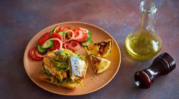 Описание: Тушки крупной скумбрии — 2 шт.чиабатта — 1 большая или 2 маленькиелука-порей — 2 крупных стеблялимон — 1 шт.сливочное масло — 80 гкрасная абхазская аджика, по желаниюпорошок карри и паприки — по 0,5 ч. л.соль, свежемолотый черный перецПодготовьте ингредиенты для приготовления скумбрии с пореем на чиабатте. Разогрейте духовку до 190 °С. Разделайте скумбрии на филе, удалите межреберные косточки, посолите и поперчите филе с обеих сторон. Можно смазать ту сторону, что без кожи, аджикой.Разрежьте чиабатту вдоль пополам (а большую еще и поперек пополам). Подсушите чиабатту в духовке до легкой румяной корочки, 5–7 минут.Очень тонко нарежьте белую часть порея и 3–4 см зеленой кольцами. Растопите в сковороде сливочное масло с щепоткой соли и томите порей на слабом огне 10 минут. Приправьте паприкой и карри, снимите с огня.Застелите противень бумагой для запекания. Выложите на бумагу чиабатту разрезанной стороной вверх. На чиабатту выложите ровным слоем порей с маслом. На порей филе скумбрии. Рядом уложите целый лимон.Запекайте скумбрию на чиабатте 10 минут. При подаче полейте соком подпеченного лимона.