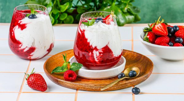 Описание: Для ягодного слоя:Ягоды 200 гМята свежая 2 веточка(и)Мед 2 ст.л.Лимонный сок 1 ст.л.Лёд колотый по вкусуДля творожного слоя:Творог 5% 100 гСливки 10% (нежирные) 100 млМед 1 ст.л.Сахар ванильный 1 ч.л.Отделите от стеблей листья мяты. Отложите несколько ягод и листочков мяты для украшения. Оставшиеся ягоды сложите в стакан погружного блендера, добавьте лед, мяту, мед и лимонный сок и измельчите до однородности. Разложите ягодное пюре в 2 высоких стакана. Соедините сливки и творог, добавьте ванильный сахар и мед и взбейте блендером. Переложите сливочную массу в стаканы на слой ягодного пюре. Украсьте смузи ягодами и мятой и сразу подавайте к столу.