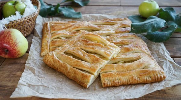 Описание: Кисло-сладкие яблоки – 2 шт.сливочное масло – 20 гсахар – 80 гготовое слоёное дрожжевое тесто – 500 гмука для раскатывания тестажелток – 1 шт.питьевая вода – 1 ч. л.Для начинки яблоки очистите, разрежьте на четвертинки и удалите сердцевины с семенами. Мякоть нарежьте небольшими ломтиками.В сковороде растопите сливочное масло. Положите яблоки и, помешивая, жарьте на среднем огне, 3 мин. Посыпьте сахаром и держите на слабом огне ещё 8 мин.Пласты теста раскатайте на поверхности, присыпанной мукой. Если тесто в рулоне, разрежьте его пополам и раскатайте. Один пласт выложите на противень, выстланный бумагой для выпечки. На пласт теста выложите немного остывшие тёплые яблоки и равномерно распределите их лопаточкой, отступая от краёв 2 см.Второй пласт теста надрежьте поперёк острым ножом, чтобы получилось 4-5 параллельных надрезов длиной 10-12 см на расстоянии 2-3 см друг от друга.Уложите подготовленный пласт теста на яблоки. Края теста соедините и плотно скрепите пальцами или вилкой, чтобы начинка при выпекании не вытекала.Верх будущего быстрого яблочного пирога смажьте желтком, взбитым с 1 ч. л. воды. Выпекайте в разогретой до 180 °C духовке 12–15 мин. На стол подавайте тёплым.