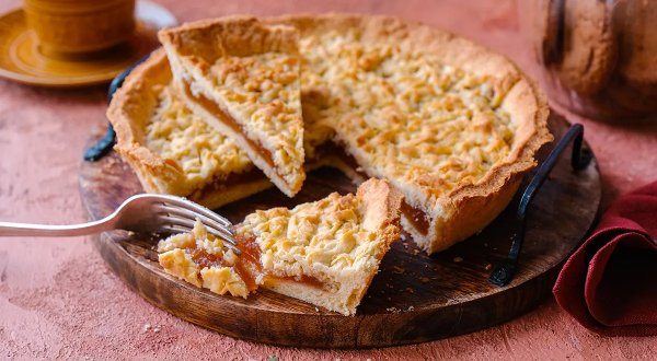 Описание: Сливочное масло – 200 гяйцо – 1 шт.сметана – 60 гразрыхлитель – 11 гсахар – 100 гяблочное повидло – 200 гсоль – 2 гмука - 410 гПриготовьте все ингредиенты для пирога с повидлом в духовке. Муку просейте с разрыхлителем в миску. Холодное сливочное масло натрите на крупной терке и добавьте к муке. Перетрите все вместе.В тесто добавьте яйцо, сметану, сахар, соль и замесите однородное тесто. Это можно сделать руками, либо при помощи кухонного комбайна. Скатайте в шар и уберите в холодильник на 30 минут.Форму для пирога смажьте сливочным маслом, присыпьте мукой. Тесто разделите на две неравные части. Меньшую часть скатайте в шар, заверните в пищевую пленку и уберите в морозилку.Большую часть теста выложите в форму, формируя небольшие борта. Сверху распределите ровным слоем повидло. Выньте тесто из морозилки и натрите его на крупной терке над пирогом. Крошка должна равномерным слоем покрыть начинку.Духовку предварительно разогрейте до 180 °С. Выпекайте пирог около 15 минут. Затем повысьте температуру до 200 °С и готовьте еще 10 минут. Выньте из духовки.Горячий пирог при нарезании будет крошиться. Поэтому полностью его остудите, а лишь затем нарежьте на порционные кусочки. Подавайте с горячими напитками.