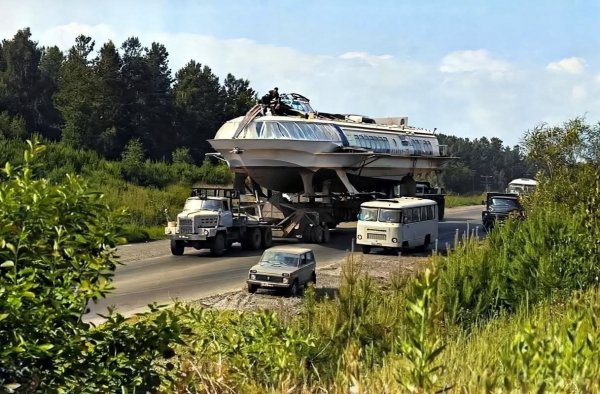 Транспортировка теплохода «Метеор-172» в город Иркутск с верфи в городе Зеленодольск. В качестве тягача используется японский лесовоз Komatsu-Nissan KNWF 12T, 1983 г.