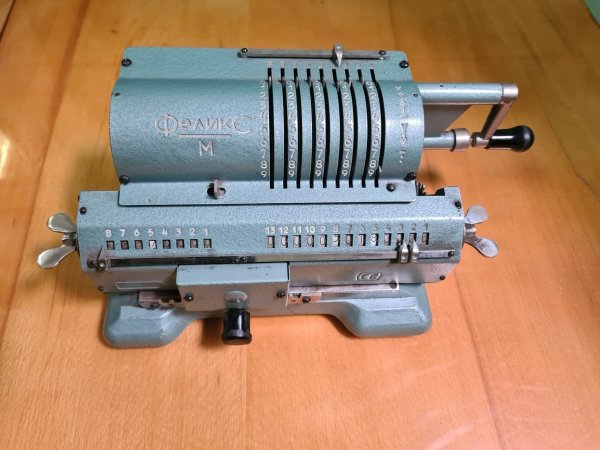 Описание: Компьютер из СССР.... Арифмометр «Феликс-М», механический калькулятор, который был самым распространённым в СССР. Он выпускался с 1929 по 1978 год на заводах в Курске, Пензе и Москве. Арифмометр предназначен для выполнения сложения, вычитания, умножения и деления. Эта счётная машина является модификацией арифмометра Однера. Модель «Феликс-М» имеет 9 разрядов для ввода чисел, 13-разрядный регистр результатов и 8-разрядный счётчик оборотов. Сброс регистров осуществляется с помощью гаек-барашков, а не рычагов.