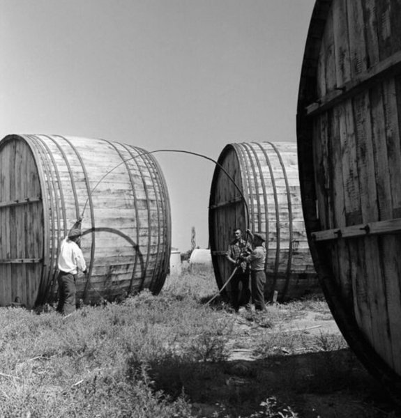 Огромные бочки с сухим вином, используемым при изготовлении коньяка, на Дербентском коньячном заводе, 1969 год.