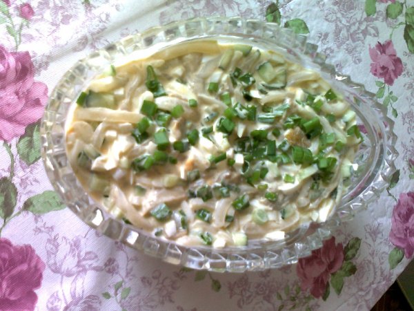 Описание: З тушки кальмаров, 3 яйца, половина 0,5 л баночки грибов белых(маслят), 3 веточки зелёного лука, 1 свежий огурец, майонез.Кальмары отварить в кипящей воде 1 мин.,порезать соломкой, грибы, огурец и варёные яйца измельчить. Добавить майонез, всё тщательно перемешать. Сверху украсить зеленью лука, укропа.