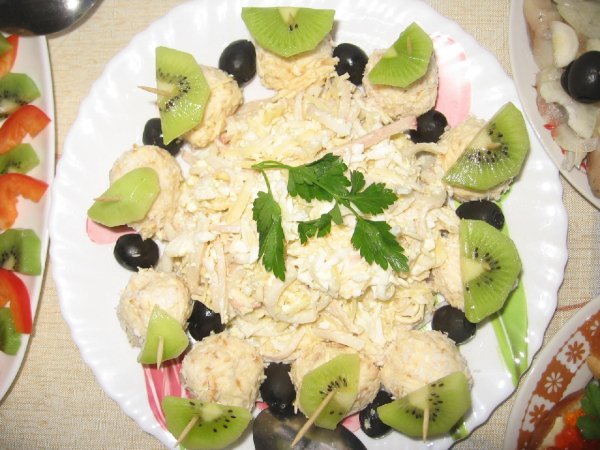 Описание: состав: сыр, кальмары, яйцо, майонез, перец молотый. кальмары отварить, порезать саломкой, сыр и яйцо на терке крупной на тереть. премешать с майонезом. украсить рафаэло из сыра(сыр на мелкой терке с чесноком,перемешать с майонезом. на ладошке сделать "лепешку" в серединку орех(фундук) и делать шарик. и затем в кокосовую стружку.) киви маслины для украшения.