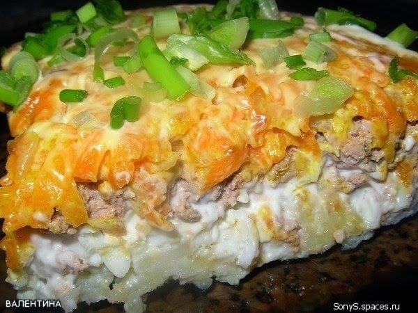 Описание: Простой печеночныйсалатикСалат очень вкусный!В этот раз вместопеченки у меня былПЕЧЕНОЧНЫЙ ПАШТЕТ ( куриный, делали сами).И мне показалось, что сним еще вкуснее инежнее!Продукты трутся накрупной терке. 1 слой-вареная тертаякартошка2 слой-вареные тертыеяйца3 слой-жареная тертаяпечень( у меня куриная).Еслиговяжья,можно и намелкой петереть-будетмягче.4 слой-жареная с лукомморковь Каждый слой майонезоми чуть присолить.Так как времени небыло,каждыйслой ,прежде чемуложить, смешивал с майонезом,выстилалцеллофаноммисочку,выложил слои вобратномпорядке,охладил вморозилке 10 минут и перевернул на блюдо.