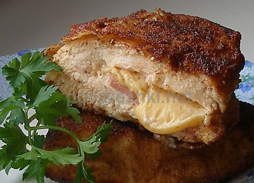 Описание: Крупное куриное филе режем на две половинки по центральному "шву".Теперь в каждом филе прорезаем кармашек вдоль всего мяса, стараясь не прорезать насквозь!Сбрызгиваем лимонным соком и приправляем карри.Пусть минут 15-20 промаринуется.Тем временем нарезаем тонко постную ветчину и потолще твердый сыр. Размер должен быть таким, чтобы эта начинка легла внутрь кармашка, не выступая наружу.Если вы приготовите такой полуфабрикат заранее, то сможете потом без особых усилий запанировать и поджарить котлеты прямо к столу.Вложите по ломтику ветчины и сыра внутрь кармашков. Если края филе свободно сомкнулись, то можете не скалывать зубочистками. Если нет, то лучше сколоть, чтобы расплавленный сыр не вытек. Делаем тройную панировку.В одной тарелочке насыпана муку, в другой взбитое яйцо, в третьей панировочные сухари из белого хлеба. Обваливаем сначала в муке, затем в яйце, потом в сухарях.