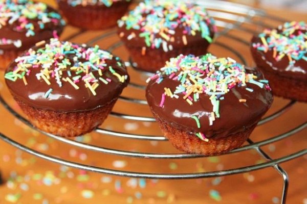 Описание: Банановые маффины с шоколадомИнгредиенты:Мука - 1/2 стаканаБанан - 2 шт.Сахар - 1/2 стаканаМасло сливочное - 50 гЯйцо - 1 шт.Разрыхлитель - 1 ч.л.Шоколад черный - 100 гПосыпка сахарная - для украшенияПриготовление:1.Время приготовления - 50 минут2.Хорошо размягченное сливочное масло взбейте миксером вместе с яйцом.3.Добавьте муку и разрыхлитель. Перемешайте.4.Банан разомните вилкой.5.Добавьте в тесто.6.Добавьте сахар и снова перемешайте.7.Выложите тесто в формы примерно на 3/4 объема.Духовку разогрейте до 200С и на 25-30 минут отправьте в нее маффины.8.Плитку шоколада разломайте на мелкие части и растопите на водяной бане.9.Вытащите маффины, дайте немного остыть и окуните верхней частью в растопленный шоколад.Сверху выложите посыпку.