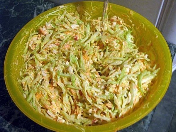 Описание: Салат "НЕДЕЛЬКА"Ингредиенты:Капуста (небольшойкочан)Морковь (2 шт.)Крабовое мясо (1упаковка)МайонезПриготовление:Мелко нашинковатькапусту, перетереть ссолью.Натереть на мелкойтерке морковь.Нарезать крабовое мясо.Хорошо перемешать,заправить майонезом ипосолить (по вкусу).Приятного аппетита!
