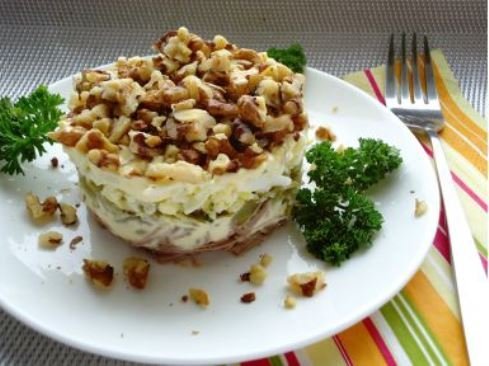 Описание: САЛАТ "ПРИНЦ"ИнгредиентыГовядина 500 грЯйцо вареное 4 штОгурцы солёные 6штЧеснок 3 долькиОрех грецкий 1стаканМайонезСольПерецСпособ приготовленияШаг 1 Говядинукладем вкастрюльку с водойи ставим вариться.Варим до готовности,солим,перчим.Отварную говядинуостужаем и режеммаленькимикубикамиилиразделяем наволокна.Шаг 2 Соленыеогурцы натираем намелкой терке исмешиваем спорубленнымчесноком.Шаг 3 Отварныеяйца натираем накрупной терке.Шаг 4 Грецкие орехиизмельчаем ,обжариваем насухой сковороденесколько минут.Шаг 5 1-й слой:выкладываемпорезаннуюговядинуисмазываеммайонезом.Шаг 6 2-й слой:огурцы с чесноком,майонез.Шаг 7 3-й слой: яйцо,майонез.Шаг 8 4-й слой:грецкие орехи.Шаг 9 Салат убираемна час вхолодильник, ондолжен пропитаться,после подаем кстолу.Приятного аппетита!