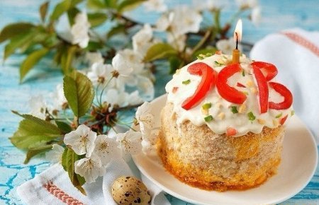 Описание: Салат " Пасхальный кулич".Ингредиенты*.куриное филе - 300 гр.*.огурцы свежие - 1-2 шт.*.яйца - 2-3 шт.*.лук зеленый - 0,5 пучка*.сыр твердый - 100 гр.*.майонез*.сметана - 2 ст. л.*.сухари панировочные*.соль, смесь перцев*.сладкий болгарский перец красныйСпособ приготовления:*.Шаг 1. Готовится салат очень просто - выкладывается слоями сразу на блюдо или тарелку с помощью специального кольца или обрезанной с двух сторон консервной банки.*.Шаг 2. 1-й слой: куриное филе отвариваем в подсоленной воде, остужаем, режем небольшими кусочками, смазываем майонезом.*.Шаг 3. 2-й слой: огурцы мелко режем, зеленый лук измельчаем, солим, перчим, майонез.*.Шаг 4. 3-й слой: яйца отвариваем и натираем на крупной терке, майонез.*.Шаг 5. 4-й слой: сыр трем на крупной терке, майонез.*.Шаг 6. Все слои повторяем, немного придавливая, до самого верха банки. Верхним слоем выкладываем натертые белки и смазанные майонезом. Поместить салат в холодильник минут на 30, после чего аккуратно убрать консервную банку.*.Шаг 7. Бока салата обсыпаем панировочными сухарями, а верх смазываем сметаной, придавая форму глазури.*.Шаг 8. Красный болгарский перец, сыр, и огурец нарезаем очень маленькими кубиками и украшаем верх салата-кулича.Приятного аппетита!