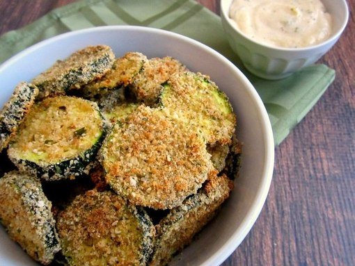 Описание: Чипсы из кабачковИнгредиенты:Кабачoк 2 штЯйцо 1 штМолоко 1 ст. л.Тертый сыр по вкусуСоль, перец по вкусуПанировочные сухари или цельнозерновая мукаЧеснок по вкусуПриготовление:1. Кабачки нарезать дольками толщиной около 0,5 см.2. Яйцо взбить с молоком.3. Сыр смешать с панировочными сухарями или мукой. Приправить солью, молотым черным перцем и добавить сушёный чеснок молотый по вкусу.4. Каждый ломтик кабачка обмакнуть во взбитое яйцо и запанировать в сырной массе.5. Выложить ломтики кабачков на противень и запекать в духовке, разогретой до 220 градусов, в течение 20 мин.6. По желанию украсить ломтиками помидора и базиликом.