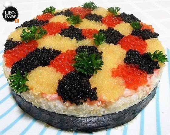 Описание: Ингредиенты: рис для суши креветки лосось, слабосоленый крабовое мясо авокадо огурец свежий яйца кунжут петрушка майонез васаби соус уксус рисовый соль сахар нори лист (для оформлениия) икра красная (для оформления)Приготовление:1. Сварить рис, как для суши.2. Делаем уксусную заправку к рису.3. Уксус из расчета 1,5 ложки на стакан риса (рисовой крупы);4. Соль 1-1,5 столовых ложки на стакан риса;5. Сахар 1-1,5 столовых ложки на стакан (крупы).6. Уксус, соль, сахар смешать и добавить в рис.7. Перемешать "режущими" движениями.8. Добавить в рис кунжут - по вкусу.9. Приготовить тонкий омлет (2-3 омлета) из 1 яйца и 1 желтка, добавив по щепотке сахара и соли. Порезать омлет.10. 1/4 часть риса смешать с порубленной петрушкой.11. Тонко порезать рыбу. Мясо краба (можно и крабовые палочки) разобрать на волокна.12. Авокадо тонко порезать, сбрызнуть соком лимона.13. Креветки отварить и порезать вдоль - пополам.14. Майонез смешать с васаби - по вкусу.15. Форму выстилаем пищевой пленкой, слегка смочить ее водой с уксусом.16. Укладываем слои (снизу): (рис слегка "утрамбовывать")1 слой: креветки2 слой: омлет мелко порезанный3 слой: рис, смазанный майонезом с васаби. Разровнять и уплотнить4 слой: крабовое мясо5 слой: рис, смазанный майонезом с васаби. Разровнять и уплотнить6 слой: авокадо7 слой: рис, смешанный с мелко порезанной зеленью петрушки. Разровнять и уплотнить8 слой: лосось9 слой: рисХорошо разровнять и придавить.Закрыть пищевой пленкой.15. Положить под гнет примерно на 1 час. (Автор предлагает не ставить в холодильник, чтобы рис не затвердел. А мне кажется - лучше поставить в хол-к - потом будет лучше резать тортик)16. Через 1 час снять груз, вытащить тортик из формы, потянув за концы пленки.17. Перевернуть на тарелку креветочным слоем вверх.18. Украсила огурцом, сверху огурец и икра, "обвязала" нори.