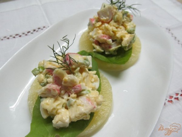 Описание: Крабовый салат наананасе.Ингредиенты:Ананасконсервированный8 шт.Крабовые палочки6 шт.Яйцо (отварное)2 шт.Сыр плавленый1 шт.Лук зеленый2 шт.Чеснок2 зубчикаМайонезпо вкусуСалат Айсберг8 листьевПриготовление:Подготовить нужныепродукты.Майонез соединить счесноком.Яйца, лук зеленый(лучше нарезать толькозеленую часть),крабовые палочкимелко нарезать. Сырнатереть на крупнойтерке.Салат заправитьмайонезом.Выложить кольцаананаса, а на ананасывыложить любыелистья салата, что бызакрыть дыры.Сверху выложить салат.Приятного аппетита!