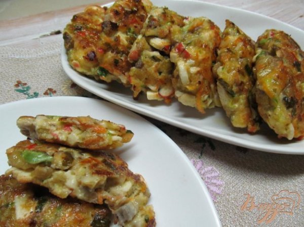 Описание: Котлеты с крабовыми палочками и кабачком. Время приготовления:20-30 минут.Ингредиенты:Крабовые палочки 6 шт.Морковь 1 шт.Кабачок 1 шт.Сыр плавленый 1 шт.Шампиньоны 5 шт.Чеснок по вкусуЗелень по вкусуСоль по вкусуПерец черный по вкусуЯйцо куриное1Майонез2 ст.лож.Крошка хлебная 3-4 ст.ложПриготовление:Подготовить продукты.Морковь с кабачком натереть на крупной терке. Отжать жидкость у кабачка.Чеснок и крабовые палочки мелко нарезать, сыр натереть на терку.Грибы с зеленью мелко нарезать.Все ингредиенты выложить в миску, вбить яйцо, добавить майонез и хлебные крошки.Посолить и поперчить. Перемешать.Хорошо разогреть сковороду, добавить растительное масло и выложить котлеты. Они хорошо формируются мокрыми руками. Жарить с двух сторон до готовности.Вот и все. Такие котлеты хороши со сметаной.Приятного аппетита!