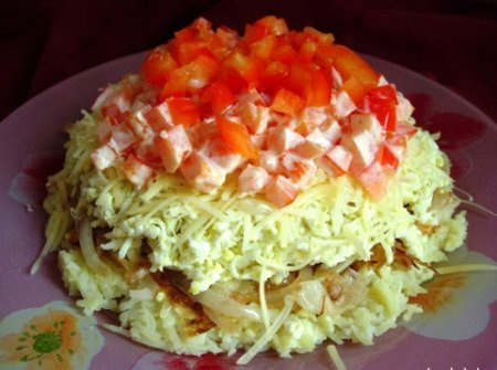 Описание: Cалат "Субботний "Ингредиенты:отварной картофель3-4 шт.лук 1-2 шт.яйцо 3 шт.сыр 100 гр.сладкий перец 1 шт.майонезСпособ приготовления:Шаг 1 Картофельчистим и трем насредней терке. Слойсмазываеммайонезом.Шаг 2 Лук чистим,режемполукольцами,обжариваемнасковороде без масла,до золотистогоцвета. Выкладываемна картофель.Шаг 3 Яйца варим,чистим , трем насредней терке ивыкладываем на лук.Смазываеммайонезом.Шаг 4 Сыр трем насредней терке икладем на яйца,майонез.Шаг 5 Перец красныйочищаем от семян,нарезаем кубиками.Половину перцасмешиваем смайонезом ивыкладываем насыр. Вторуюполовинувыкладываемнаверх без майонеза.Приятногоаппетита!