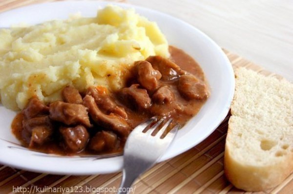 Описание: Гуляш с подливкой икартофельным пюрекак в садике.Ингредиенты:-Говядина - 0,5 кг.-Лук репчатый - 1 шт.-Морковка - 1 шт.(можно без нее )-Мука - 1 ст. л-Том. паста - 1 ч.л-Можно сметану - 1 ст. л(у меня без нее )-Лавровый лист - 1 шт.-Соль по вкусу - 0.5 ч.лпримерноНарезать мясо нанебольшие кусочки,слегка обжарить(можно не обжаривать,а сразу добавить в мясонемного кипятка) ипотушить вместе слуком и тертойморковкой всобственном соку нанесильном огне,немного налив вкастрюлю раст. масла.Затем долитьнебольшое количествоводы. Ну скажем, наполкило мяса стаканводы. Тушить доготовности мяса ( т.е домягкости). Мясо должнобыть слегка прикрытобульоном. Минут за 10до готовности мяса,посолить по вкусу,положить лавровыйлист - 1 шт. и можно 3шт. перца горошком.Мясо бывает разное.Поэтому времяприготовления можетбыть тоже разное. Нокак правило около часа,не меньше ( если этоговядина или свинина, ане цыпленок)Готовность проверяетсяножом или вилкой.Затем развести вполовине стаканатеплой воды - 1 ч.л томпаcты, ст. ложку муки ист. ложку сметаны( можно без нее, у менябез...).Хорошо перемешать встакане, чтобы не былокомочков. Я это делаювсегда вилкой.Непрерывнопомешивая гуляш,влить туда смесь. Гуляшна глазах начнетгустеть.Потушить немного(минут 5-10) Мясоготово.Если при тушении водавыкипела, можнодолить ее. И если вдруггуляш получилсяслишком густой, томожно тоже разбавитькипяточком до нужнойгустоты.Отварить картофель вводе.Воду слить, но не доконца, чтобы на днеоставалось немного.Помять в отварехорошенько картофель.Лишь тогда, когдакартошка хорошоразмята, добавитьгорячее молоко, соль имасло по вкусу.С отваром пюре легче,не вязкое и вкуснее.Дети такое пюре едятхорошо.Приятного аппетита вами вашим деткам!