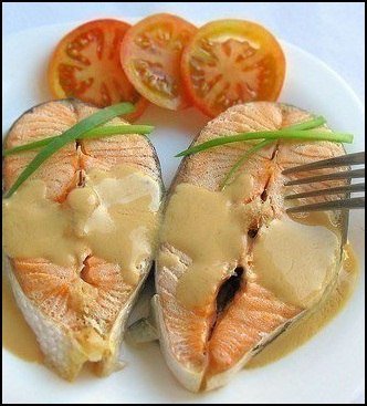 Описание: Семга на пару.На 100 г - 119 ккал.Для приготовления намнужно:- 4 стейка семги;- 2 ст. ложки соевогосоуса; 1 ч. ложкилимонного сока;Приступаем кприготовлению:Берем лимонный сок исоевый соус -смешиваем. Кладемстейки в посуду,заливаем маринадом,убираем в холодильникна 30 минут, достаем иотвариваем на паруоколо 20 минут.Если у вас нетпароварки, можетеиспользоватьметаллическийдуршлаг. Наливаем вкастрюлю коло 1/3воды, сверху помещаемдуршлаг так, чтобымежду его дном иповерхностью водыбыло примерно 2 см.Кладем в дуршлаг рыбуи накрываем крышкой.Доводим воду докипения и варим рыбудо готовности.Подавать с гарниром избурого риса, паровыховощей.Приятного аппетитадрузья :)