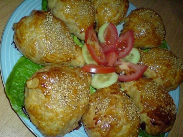 Описание: Окорочка в слоеномтесте.Ингредиенты:окорочка куриные(нижняя часть) 8 шт.,сыр плавл. для тоста 4шт.,чернослив 8 шт.,коньяк 2-4 ст.л.,грецкие орехи 8половинок,яйцо,соль,перец,чеснок,слоёное тесто 400 гр.,кунжут 1-2 ст.л.Как приготовить:Сегодня на обед яприготовилаокорочка,которыестояли ночку вхолодильнике имариновались всоли,перце и чесноке.Разморозила слоёноетесто,мне попалось уженарезанное наквадраты.Промазала каждыйвзбитымбелком,положилаполкусочка сыра.В окорочек возлекосточки заталкалачернослив,вымоченныйв коньяке(полчаса),иполорешка грецкого,завернула в тесто ивыложила напротивень,покрытый пергаментом.Смазала каждый"конверт" желтком ипосыпала кунжутом,отправила в разогретуюдо 180 духовку насреднюю полочку начас,если тестозарумянитсяраньше,прикройтепротивеньфольгой,чтобы непригорело..Сервировала совощнымсалатом,вкусно очень икрасиво!!!