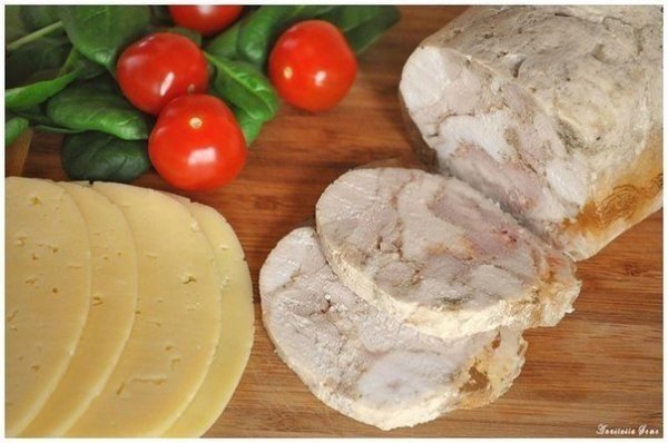 Описание: Замена колбасе -куриный рулет.Ингредиенты:1 кг куриного филе,25 г. желатина,2 зубчика чеснока,соль,паприка,чёрный молотыйперец,сухие травы.Приготовление:1. Филе нарезатьнебольшими кусочками,чеснок натереть намелкой тёрке.2. Все ингредиентыхорошо перемешать,выложить на пищевуюплёнку и плотнозамотать в несколькослоёв (7-10 дляпрочности),сформировав брусок.3. Положить в воду иварить 1 час.4. Слить воду и датьостыть до комнатнойтемпературы.5. Убрать вхолодильникполностью остыть изастыть.Приятного аппетита!