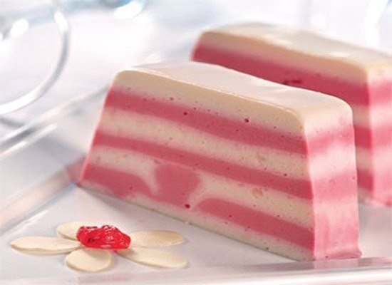 Описание: Кефирное желеСостав:кефир 1,5 лжидкий мед 3 ст. л.желатин 40 гвишневый сироп 4 ст.л.тертая лимонная цедра 1 ст. л.сметана 200 гванилин 1 ч. л.Приготовление:Желатин залитьполовиной стаканахолодной кипяченойводы, оставить на 20мин.Кефир перелить вмиску, добавить сметануи тщательноперемешать.Влить мед и взбитьсмесь венчиком.Желатин нагреть намаленьком огне,постоянно помешивая,до полного егорастворения.Дать остыть и влить вкефирную смесь.Положить ванилин ицедру, хорошоперемешать.Отлить треть смеси вотдельную емкость,добавить в неевишневый сироп.Тщательно взбить дополучения однородногонасыщенного цвета.Влить в прямоугольнуюформу тонким слоембелую кефирную смесь,поставить на 15 мин. вхолодильник.Вынуть форму сзастывшим желе, влитьсверху розовую смесь ивернуть в холодильник.Таким образомзаполнить формубелыми и розовымислоями, ставя каждыйраз в холодильник на1015 мин.Дать полностью застытьв холодильнике, еще 1час.Перед подачей к столуперевернуть желе натарелку и нарезатьломтиками.Можно украситьсвежими ягодами,орехами или цукатами.100 гр. готового десертасодержат:86 ккалбелки 5,2 гр.жиры 2,6 гр.углеводы 10,4 гр.