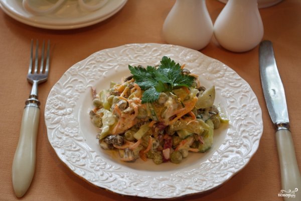 Описание: Салат "Лесная сказка" сгрибами.Время приготовления:20 мин Описаниеприготовления:Салат состоит из разныхингредиентов, но ихсочетание даетнеповторимый вкус.Грибы замочите иотварите. Затемобжарьтеизмельченные грибы слуком. Остальныеингредиенты нарежьтеи смешайте все всалатнике, заправивмайонезом.Ингредиенты:Лесные грибы — 100ГраммСвежий огурец — 1ШтукаМорковь по-корейски — 100ГраммСоленые огурцы — 2ШтукиВарено-копченаяколбаса — 150 ГраммГорошекконсервированный— 3 Ст. ложкиЗелень — 1 ПучокМайонез — По вкусуРепчатый лук — 1ШтукаРастительное масло— 20 МиллилитровКоличество порций: 6Как приготовить "Салат"Лесная сказка" сгрибами":Свежий и соленыйогурцы нарезаемсоломкой.Добавьтеконсервированныйгорошек.Сушеные грибы залитькипятком. У меня белыегрибы. Когда грибыразмякнут, переложитеих в чистую воду.Поставьте на огонь ипроварите 15 минут.Извлечь грибы из воды,нарезать соломкой. Насковороде обжарьтелук, добавьте грибы.Посолите и поперчите.Обжаренные грибы слуком переложите всалат.Морковку по-корейскинарезать и добавить всалат. Морковкунарезаем, чтоб былоудобнее кушать.Варено-копченуюколбасу нарезатьсоломкой.Добавьте в салат зелень.Заправьте майонезом иподайте к столу.