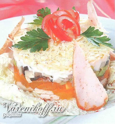 Описание: салат свадебныйПорций: 4-5Время приготовления:70 мин.Что нужно длясвадебного салата:1 куриная грудкамайонез1-2 помидора1-2 моркови200 г шампиньонов1-2 луковицы100 г сыра2 маринованных огурца2-3 яйцазелень петрушкирастительноемасло дляжареньяКак приготовить салатсвадебный:1. Куриную грудкуобжарить доготовности, охладить,нарезать мелкимикусочками.Шампиньоныи лукмелко порубить,обжарить в масле доготовности, охладить.Морковь отварить,охладить, натереть накрупной терке.Помидоры и огурцынарезать мелкимикубиками. Сыр ивареные яйца поотдельности натеретьна мелкой терке.2. Выкладывать салатслоями в прозрачныйсалатник или наплоское блюдо.1-йслой - куринаягрудка; 2-й спой -помидоры; 3-й слой -шампиньоны с луком: 4-й слой - морковь; 5-йслой - огурцы; 6-й слой -яйца; 7-й слой - тертыйсыр. Каждый слойпромазатьмайонезом.Верхсалатаукрасить розой изпомидора, веточкамипетрушки. Дать салатупропитаться.
