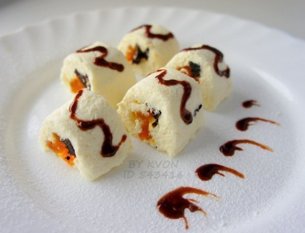 Описание: Творожный ролл ссухофруктамиВам потребуется:200 гр творога1 ст.л. сахарной пудры1 ст.л. кокосовойстружки3 кураги3 черносливаПриготовление:1. Творог перемешать ссахарной пудрой.2. Чернослив и курагунарезать соломкой.3. На пищевую пленкунасыпать кокосовуюстружку, выложитьтворог, разровнять.4. На творог выложитьчернослив, затем курагу(также как если бы выделали обычные роллы), свернуть плотнымрулетом, отправить на15 минут вхолодильник.5. Нарезать рулет напорционные кусочки.Если творог будетприлипать, ножобмакните в воду.6. При подачиприсыпать сахарнойпудрой и украситьшоколадом или вашимлюбимым конфитюром.Кушайте судовольствием