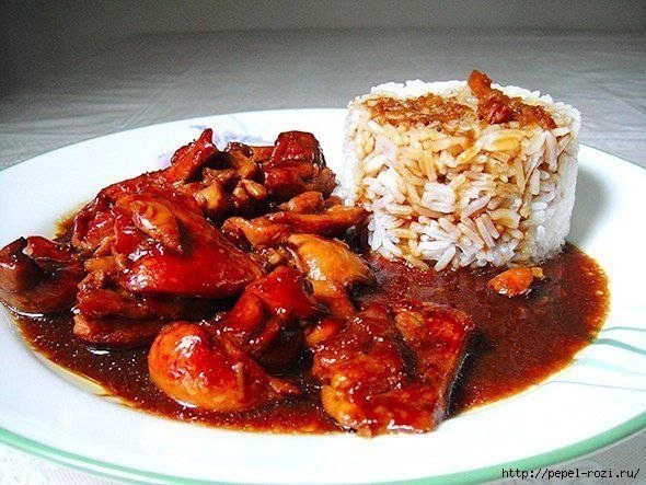 Описание: Курица тереякиИнгредиенты:Куриное мясо 1 кгСоевый соус 125 млЯблочный уксус 4 ст.л.Перец молотый 1 ч. л.Бурый сахар 150 гКрахмал 2 ч. л.Чеснок 4 зубкаИмбирь см 8-10.Приготовление:1. В маленькийкастрюльке смешатьсахар, соевый соус,уксус, перец, крахмалразведённый в 50 млпрохладной воды,натёртый на тёркеимбирь и чеснок.2. Помешивая, доведёмдо кипения, соус обязанзагустеть.3. Противень смажеммаслом.4. Выложим курицу.5. Хорошо польёмсоусом и отправляемвсё это впредварительноразогретую духовку(220градусов)на 30 минут.6. Через каждые 5-7минут размешиваем,чтобы курицапревосходнопропиталась соусом.
