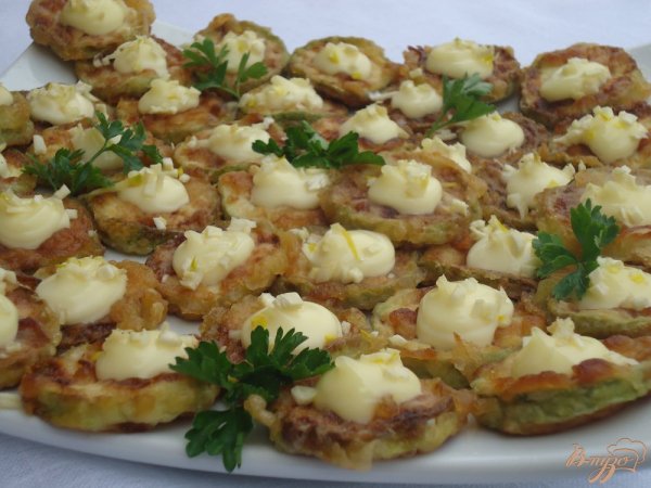 Описание: Закусочные пикантныекабачки.Время приготовления:20-30 минут Замечательная овощнаязакуска, одна из самыхлюбимых в моей семье.ИнгредиентыКабачок2 шт.Чеснок2 зубкаЯйцо куриное1 шт.Мука100 гМасло растительноедля обжаркСольпо вкусуПерец черныйпо вкусуМайонезпо вкусуПриготовлениеКабачки моем инарезаем кружочками.Яйцо слегка взбиваемвилкой. Обмакиваем вяйцо кружочкикабачкови затем обваливаем их вмуке с двух сторон.Обжариваем кабачки наразогретомрастительном масле собоих сторон дозолотистого цвета.На кабачки наносимнемного майонеза,а сверху посыпаеммелко измельченнымчесноком.Приятного аппетита!