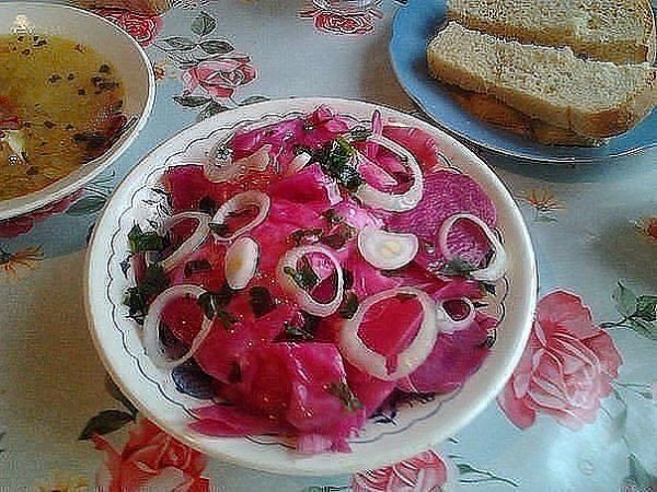 Описание: Ингредиенты:- кочан белой капусты,- свекла,- чеснок,- стручок горького перца,- чёрный горошком перец,- соль,- крутой кипятокПриготовление:1. Режем кочан капусты кусками вместе с кочерыжкой, свеклу разрезаем кружочками, чистим чеснок, нарезаем кусочками горькую перчину.2. В глубокую кастрюлю складываем слоями:куски капусты, затем кружки свеклы, затем дольки чеснока, и кусочки гор. перца, перец чёр. горошком, и так кладём слой за слоем чтобы до краёв кастрюли куда мы всё это уложим оставалось ещё свободного места вверх около 5 см.3. Кипятим в другой кастрюле воду и кладём в неё соль, рассол должен получиться чуть солонее чем вы предпочитаете солить бульоны первых блюд.4. Заливаем горячим рассолом уложенные слои овощей, кладём гнёт в виде перевёрнутой вверх дном тарелки и закрываем крышкой. Через 4-5 дней капуста готова.5. Рассол из под неё похож на свекольный квас и он тоже оч. полезен для жкт. Попробуйте приготовить, приятного вам аппетита!Приятного аппетита!