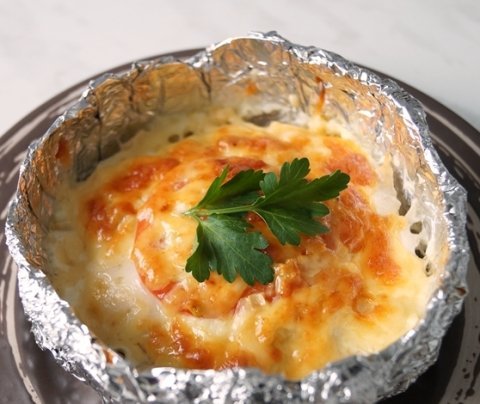Описание: КУРИНОЕ ФИЛЕ"СЮРПРИЗ" ИнгредиентыФиле куриное 3 шт.Молоко 1 стаканКартофель 6 шт.Лук 1 -2 шт.Помидор 2 шт.Яйцо 2 шт.Чеснок 2 - 3 зубчикаСыр 150 - 200 гр.Масло растительноеМайонез 3 ст. л.Соль, перецЗеленьСпособ приготовленияШаг 1 Куриное филенарезаем кусочками .Заливаем молоком идаём постоять 1 - 1,5часа.Шаг 2 Делаем формыдля запекания,фольгу складываемв несколько раз иукладываем на днобанки из попкорнаили сметаны.Шаг 3 Подгибаемкрая, чтобыформочка былапоравнее и снимаемс банки.Шаг 4 Формы ставимна противень.Смазываем каждуюформу растительныммаслом. Картофельрежем кружочкамии выкладываем вформу. Солим,перчим.Шаг 5 Лук чистим,режемполукольцамиивыкладываем накартофель.Шаг 6 На лук кладемкуриное филе.Солим, перчим.Шаг 7 В тарелкуразбиваем яйца,добавляем майонези хорошо взбиваем.Шаг 8 Яично-майонезную смесь по2 столовые ложкизаливаем курицу.Шаг 9 Сверху кладемпомидор,нарезанныйкружочкамиирубленный чеснок.Шаг 10 Посыпаем всетертым на среднейтерке сыром.Шаг 11 Противеньставим в разогретуюдуховку до 180градусов на 20минут.Шаг 12 Украшаемзеленью и подаём кстолу .Приятного аппетита!