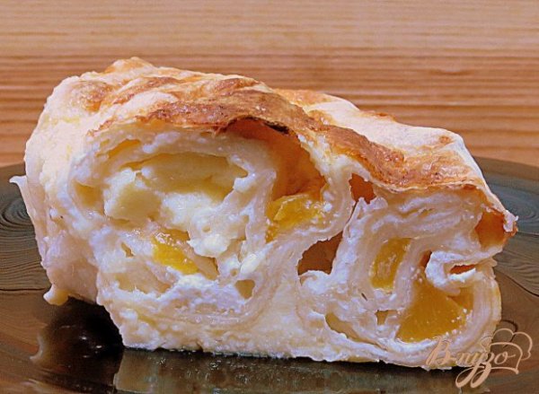 Описание: Лаваш с начинкой изтворога и персиковВремя приготовления:30-60 минут Отличный десертныйрулет, вполне заменитвам пирог.За рецептблагодарна Танюшкетортик.ИнгредиентыЛаваш3 шт.Творог700 гЯйцо куриное6 шт.Консервированныеперсики700 гСахар6-8 ст. л.Сметана 30%жирности200 гКрупа манная1 ст. ложКрахмал1 ст. лож.Ванильная эссенция0,5 ч. ложПриготовлениеДля приготовления нампонадобится лаваш,творог, яйца, персики,сметана, сахар, маннаякрупа, ванильнаяэссенция.В большую чашукомбайна отправьте 3яйца.Добавьте сахар ивзбивайте насадкойметаллический нож.Добавьте творог,ванильную эссенцию,манную крупу икрахмал. Продолжайтевзбивать вместе.Форму застелитебумагой для выпечки,смажьте маслом.Разверните на столе 1лист лаваша и покройтеего творогомПерсики порежьтемаленькими кусочкамии разложите их сверхупо творогу.Затем лавашскручивайте по длине,рулетиком. Такжепоступите с другимидвумя пластами лаваша.Рулетик складывайтеспиралью в форму длязапекания.Следующие рулетикивыкладывайте также.Нам понадобились 2формы.Делаем заливку. Взбитьвместе 3 яйца,сахар исметану.Заливка готова.Заливаем заливкойпироги.Отправляем их вразогретую духовку до190* на 45 минут.Овальный пирог готов.Круглый пирог готов.Разрезаем и угощаемродных и близких.
