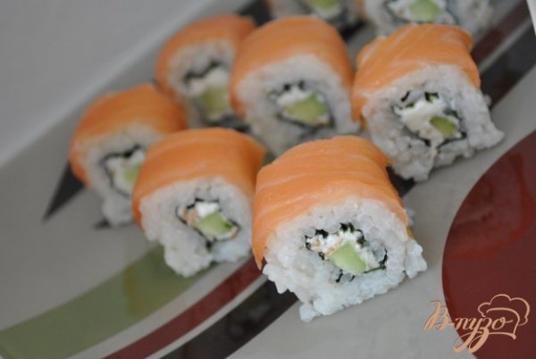 Описание: Роллы с копченымлососем и огурцомВремя приготовления:30-60 минут Вкуснятина!ИнгредиентыРис для суши1 стакУксус рисовый50 млСахар1 ч.л.Соль0,5 ч.л.Сыр филадельфияЛосось копченыйОгурецВодоросли нориКунжутПриготовлениеОтварить рис, дать стечьчерез дуршляг 5 минутСмешать рисовый уксус ссахаром и сольюВыложить горячий рисна поднос, политьуксусом и аккуратноперемешатьОчистить и нарезатьдлинной соломкойогурец. Подготовить всенужные ингредиенты.На циновке разложитьмокрыми руками рис(2-3 стол.ложки). Сверхуположить лист нори,намазать сыром,посыпать кунжутом,выложить огурец.Завернуть роллПоложить сверху лососьи еще раз прижать спомощью циновкиМокрым и очень острымножом нарезать ролл на6-8 частейПодавать с соевымсоусом и васаби, ктолюбит острое.Приятного аппетита!